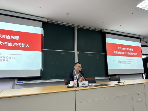 习近平法治思想是全面依法治国的根本遵循和行动指南,为深入学习习近平法治思想,全面贯彻落实党的二十届三中、四中全会精神,进一步引导青年学生树立法治信仰、增强法治素养,2025年11月19日法务与规划发展处(职业教育研究所)组织开展了习近平法治思想主题讲座。衢州市学习贯彻习近平法治思想宣讲团成员、中共衢州市委党校姜裕富教授担任主讲90余名新生代表参加。